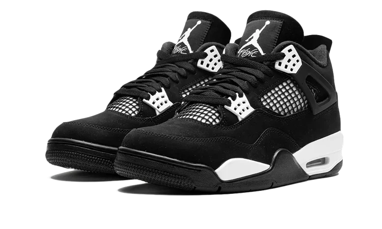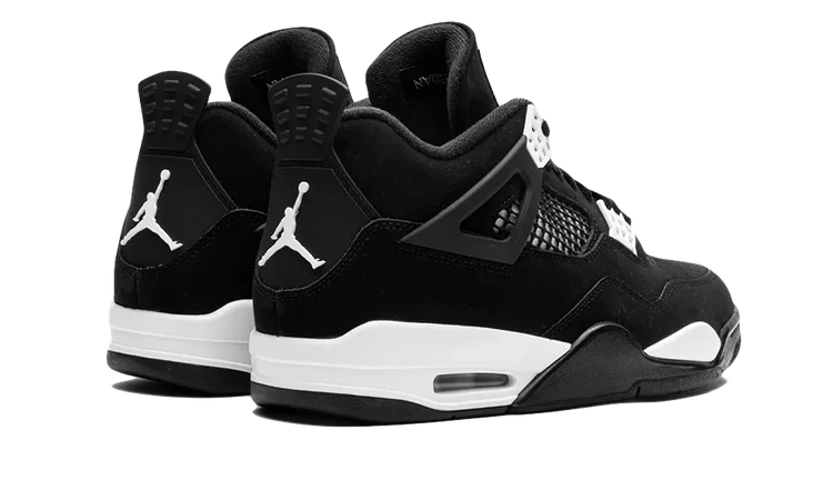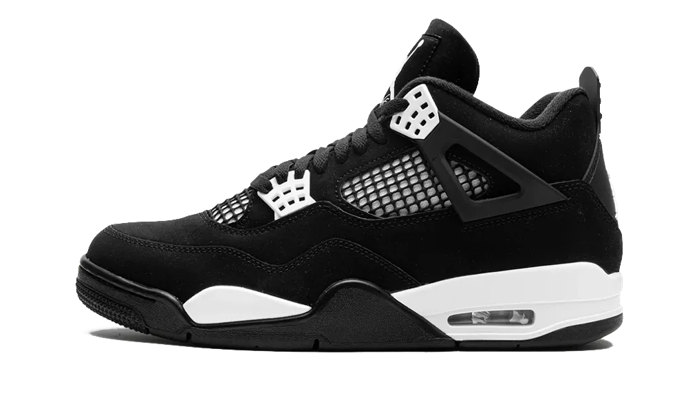 The Air Jordan 4 Retro ‘White Thunder’ sports a black suede upper with contrasting white accents on the molded eyelets and mesh quarter panel, the latter covered in black netting. Matching white Jumpman logos decorate the woven tongue tag and molded heel panel. Lightweight cushioning arrives via a white polyurethane midsole, fitted with a visible Air-sole heel unit and supported by a black herringbone-traction rubber outsole.
